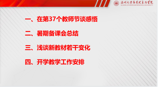 原理教研室在9月10日晚6点半,以腾讯会议方式在线上召开了新学期第一次集体备课会。会议由教研室主任骆徽主持。