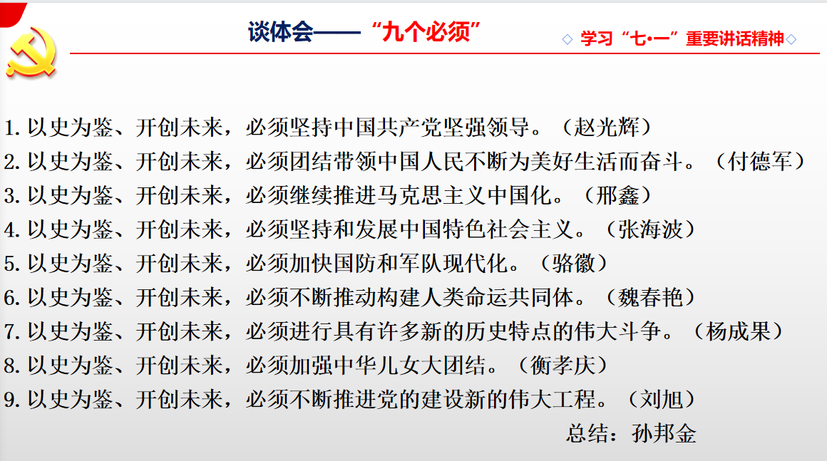 孙邦金副院长作了“习近平总书记在庆祝中国共产党成立100周年大会上的讲话”学习体会,并对上述九位老师“九个必须”学习体会进行了详细点评。九个“必须”既是历史经验的总结,也是未来发展的指南。从领导核心、根本宗旨、指导思想、道路自信、安全保障、国际格局、斗争精神、统一战线、政治保证(党的建设)等原则性结论,都是用鲜血换来的结论,必须坚持和不断强调。这是保证继续成功开创未来并保证我们中国特色社会主义伟大事业不变质、不变色、不变味的思想基础。