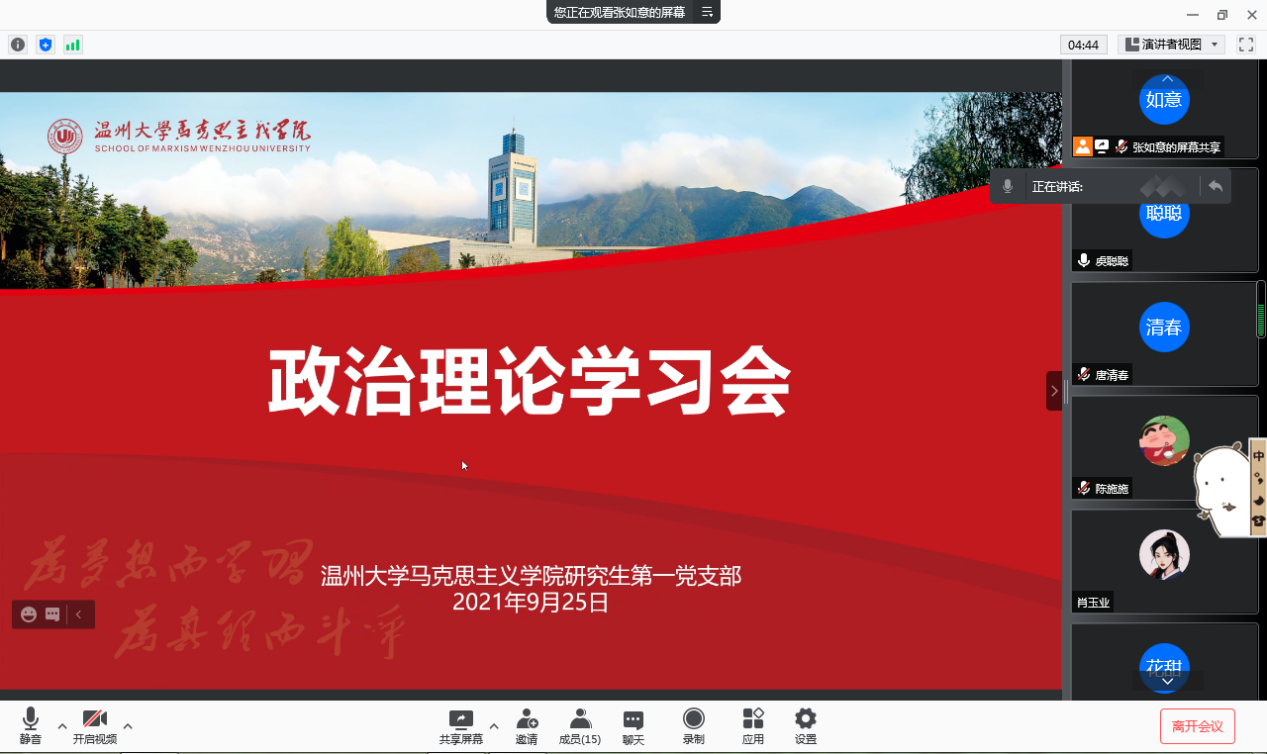 9月25日晚,yl6809永利研究生第一党支部于线上召开政治理论学习会,全体党员参与会议,会议由党支部副书记张如意主持。