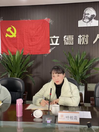 会议最后,叶柏霜副书记做总结发言。首先,叶书记充分肯定了在座党员在过去一年中取得的成绩,并提醒各位党员同志要对收获和不足进行及时盘点,积极吸纳他人意见,并将其作为自己努力的方向。其次,叶书记提出了“三个心”:一是敬畏心,作为马院研究生,要讲政治、知大局、守纪律,在关键时刻体现正确站位,遵守政治纪律,及时了解政策,做模范遵守的典范;二是智慧心,在可自由支配的时间里,不断精进学业,发力科研,把焦虑的心情恢复到日常细节之中,做生活中的主动者、掌控者;三是大爱心,马院学生要讲情怀、讲奉献、讲格局、讲担当。各位党员同志都要在各自的岗位中奉献自己,在学院和学校发展进程中发挥自己的力量。最后,叶书记强调,各位同志要加强身体锻炼,身体是革命的本钱,一个好的身体可以为我们助力前行。同时,在工作过程中,大家要牢记自己的第一身份还是学生,科研是立身之本,除了做好本职工作外,学业也非常重要,希望同学们高效率分配时间,平衡好学业、工作和生活,带着“三个心”开启全新的2022年,立下更多目标,实现更多梦想,为研究生之路增光添彩。