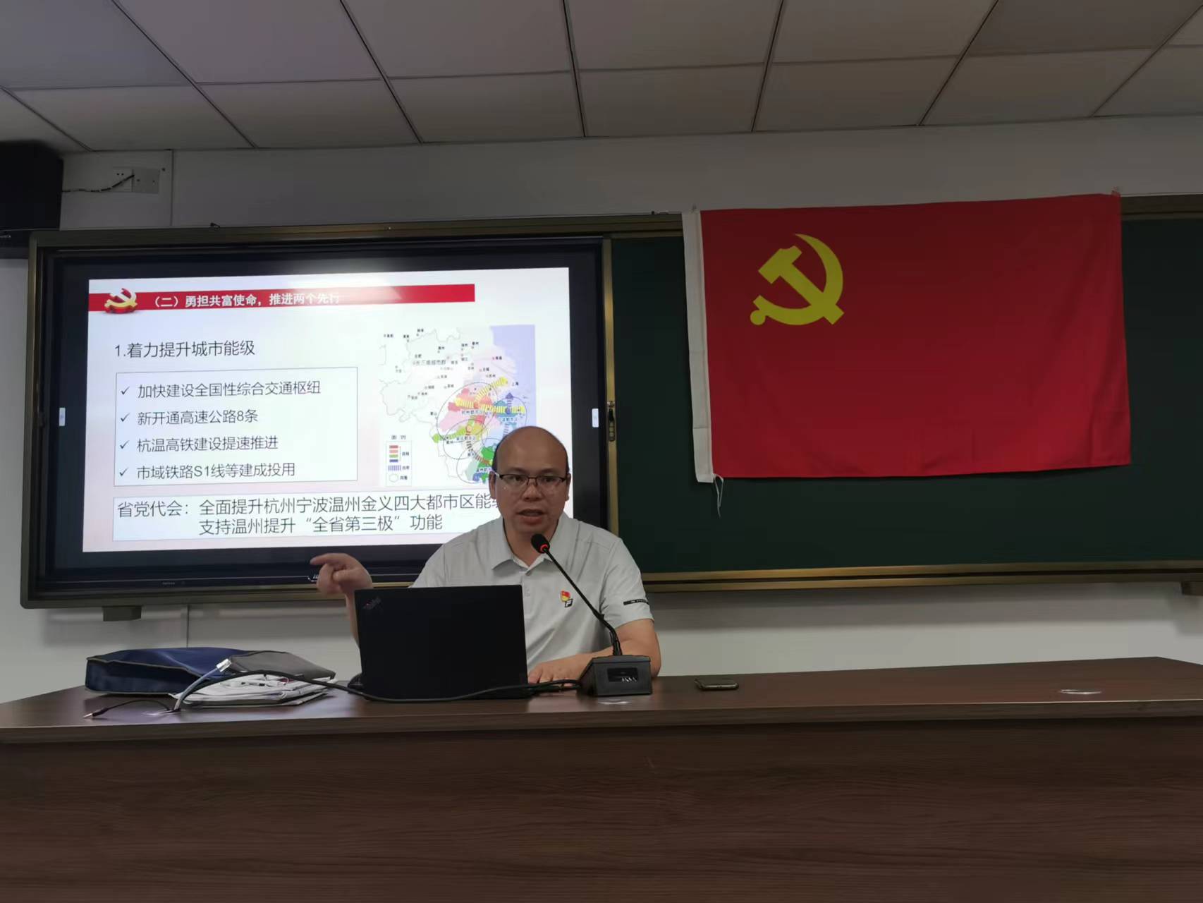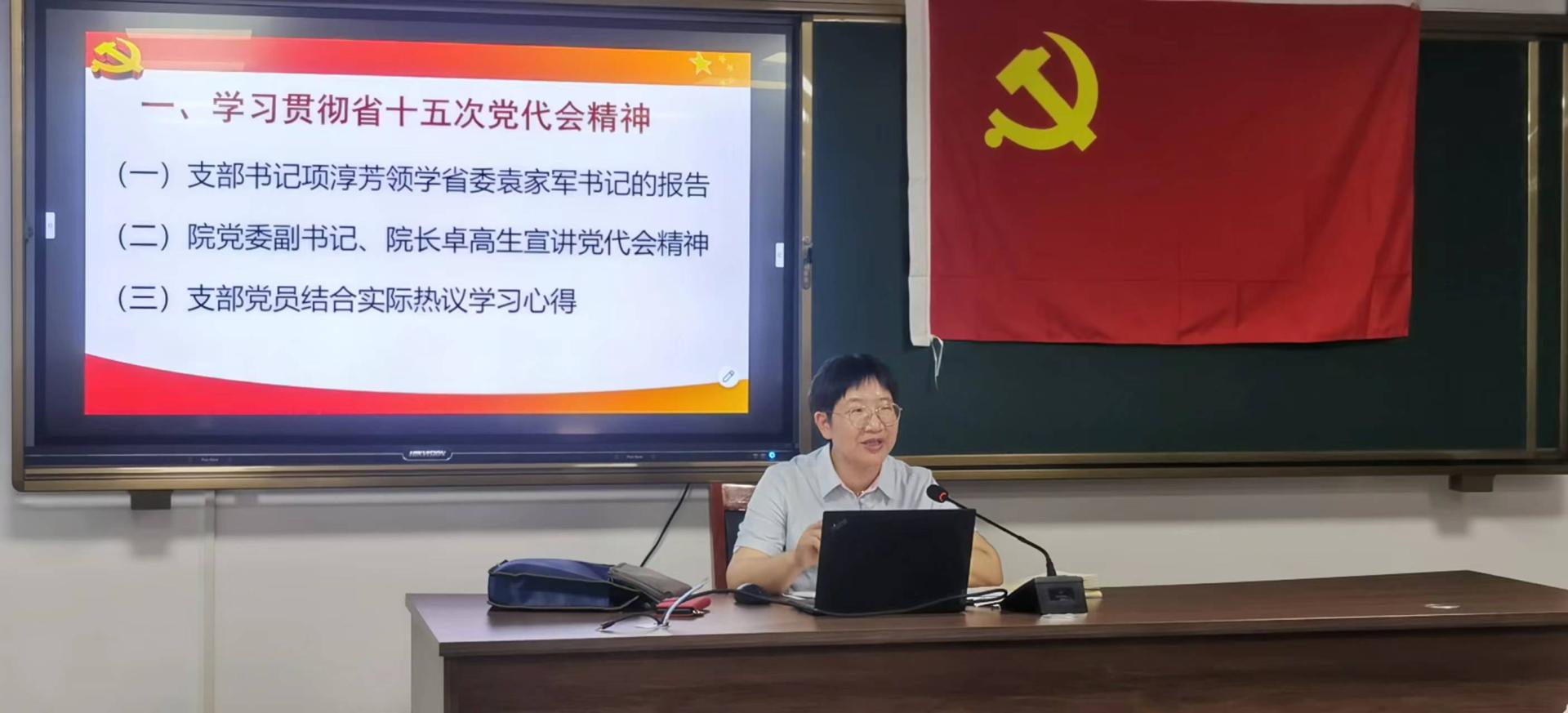 支部书记项淳芳领学省十五次党代会报告。党员们对照省第十五次党代会《忠实践行“八八战略” 坚决做到“两个维护” 在高质量发展中奋力推进中国特色社会主义共同富裕先行和省域现代化先行》的报告全文认真学习,并结合张振丰市长向温大师生所作的省第十五次党代会精神宣讲,重点围绕本次党代会的主题、里程碑意义、浙江省推进“两个先行”的自信底气(“9个这五年”的历史经验)、指路明灯(“5大战略指引”和“11方面重要遵循”)、具体目标(“打造8个高地”)、战略举措(“5大工作导向”和“10个着力”)等进行学思悟践,强调要结合工作实际,把自己摆进去,在原原本本、原汁原味学中做到内化于心、外化于行,以钉钉子精神推动省党代会精神落实落地。