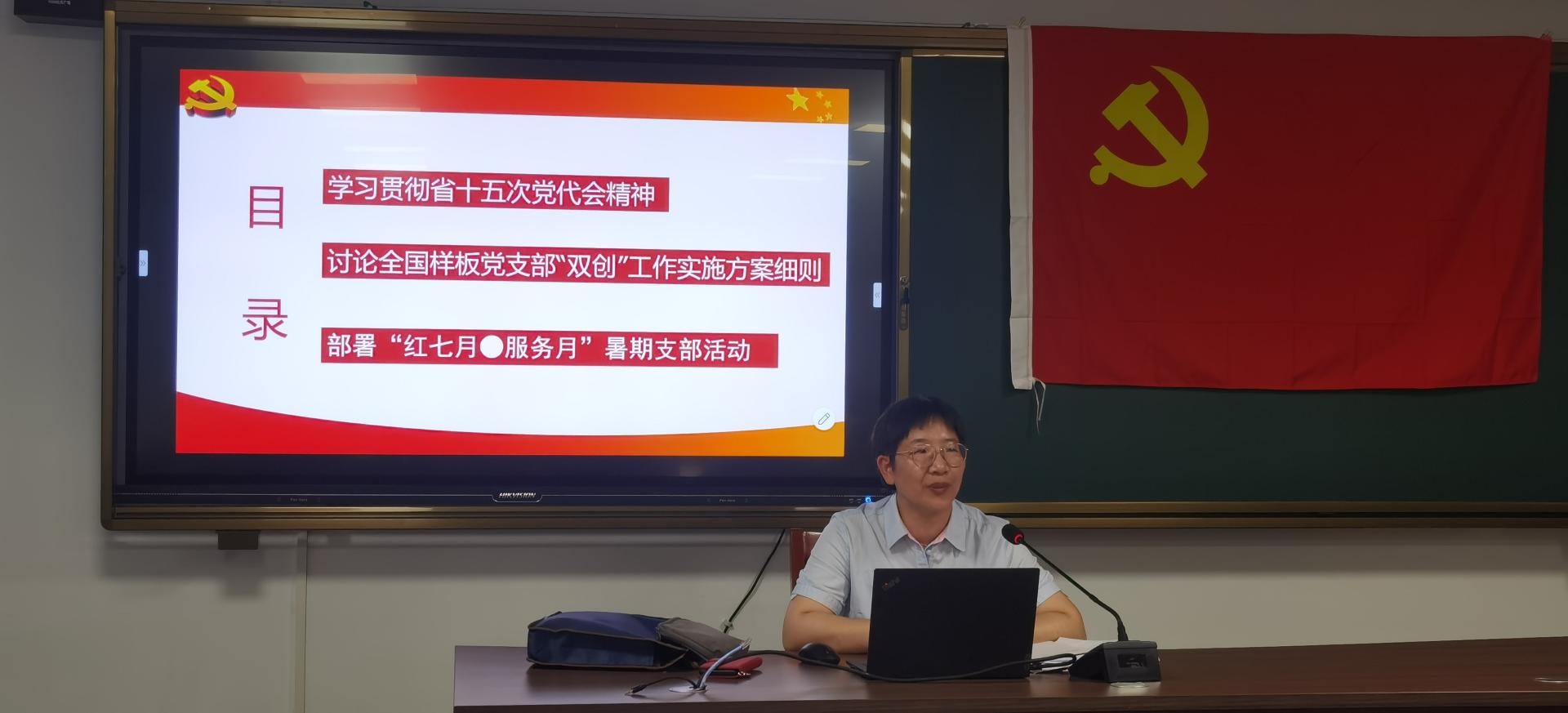 项淳芳结合省党代会报告提出的“打造新时代党建高地”的目标,向支部党员介绍了全国样板党支部“双创”工作实施方案、工作目标、计划举措、进度安排,分析了支部建设的现状和亟待解决的问题,动员每一位党员都要秉持“没有走在前列也是一种风险”的忧患意识,增强“当先锋,争先行”的先锋意识和使命感,唯实惟先,以新时代高校党支部“双创”工作重点任务指南为指引,以党支部“七个有力”为建设标准,围绕学校学院稳定改革发展的中心工作开展支部建设,凝心聚力,群策群力,奋力打造教学科研育人服务等标志性成果,实现高质量发展和各项事业全面进步。最后部署和讨论了“红七月∙服务月”暑期支部活动。