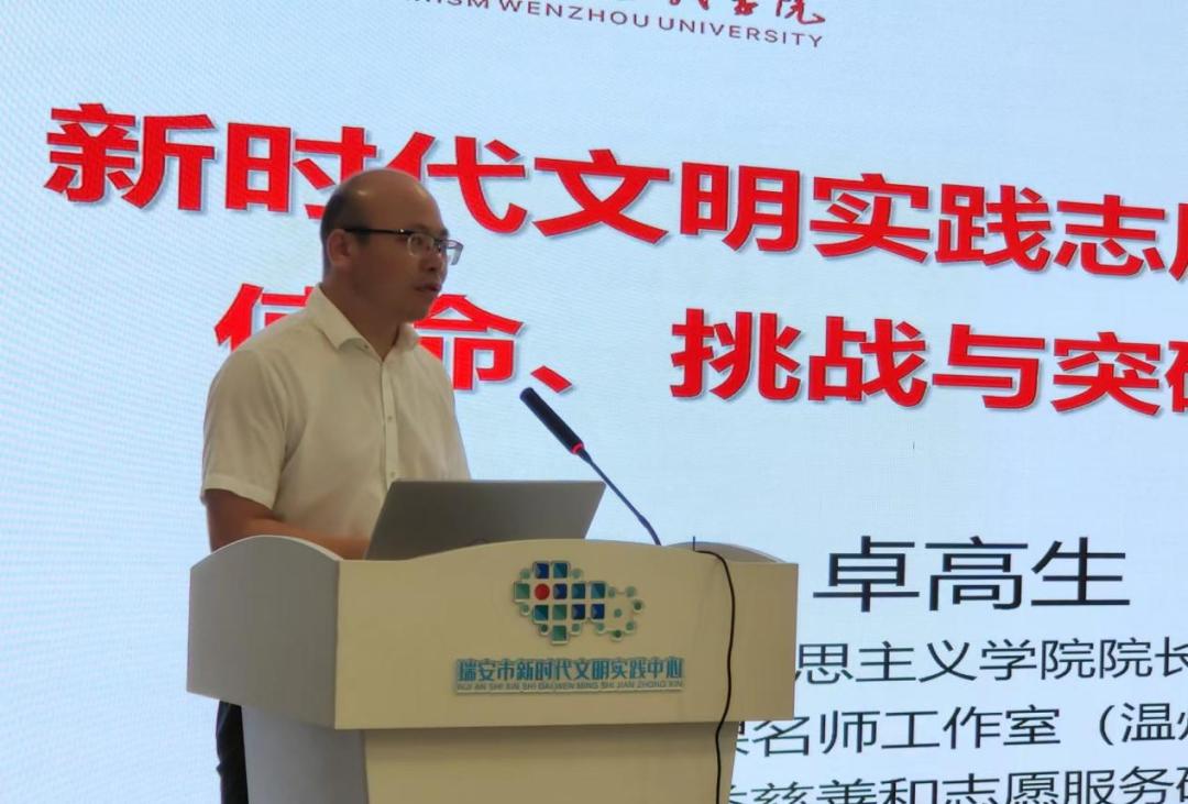 卓高生院长在高度认可和评价中心成员的主题宣讲之后,延伸话题并做《新时代文明实践志愿者服务的使命、挑战与突破路径》主旨发言。他从明确新时代文明实践志愿者服务任务、构建服务体系、开展服务活动、打造服务阵地、建设运行机制、面临的挑战和发展路径等多方面,就如何改善和加强基层思想政治工作,深化群众性精神文明创建,建设新时代文明实践中心进行宣讲,引起听众的广泛共鸣,也引发了大家进一步深思。