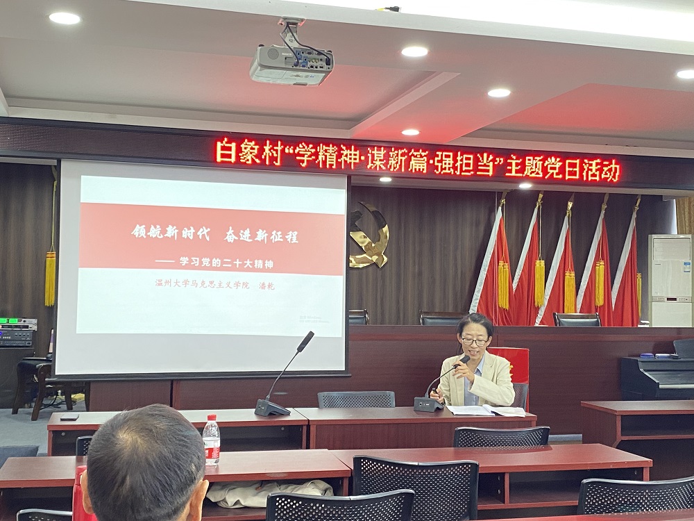 2022年11月18日上午,yl6809永利李红梅教授来到温州市瓯海区南白象街道金竹村党员活动中心,为全村的党员同志作了以“学精神、谋新篇、强担当”为主题党的二十大精神学习讲座。