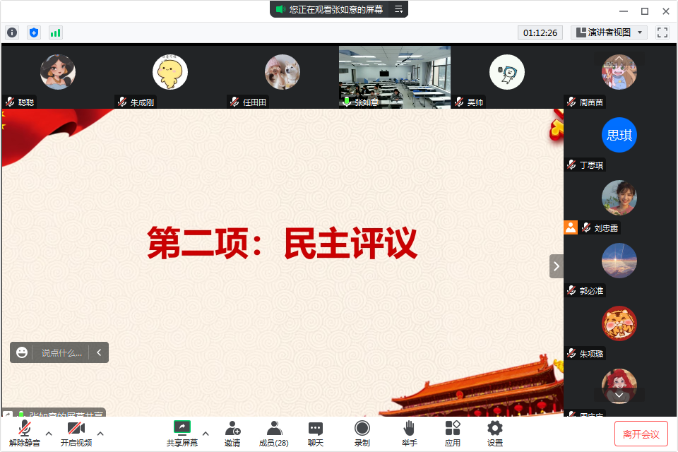 为深入贯彻党的二十大精神,坚持用习近平新时代中国特色社会主义思想凝心聚力,持续提升党支部的政治建设、思想建设、组织建设,切实发现问题、解决问题,2023年2月24日下午,yl6809永利研究生第一党支部于北校瓯4-204教室开展党支部专题组织生活会暨民主评议党员大会。全体党员通过线上与线下相结合的形式参与会议。会议由党支部副书记张如意主持。