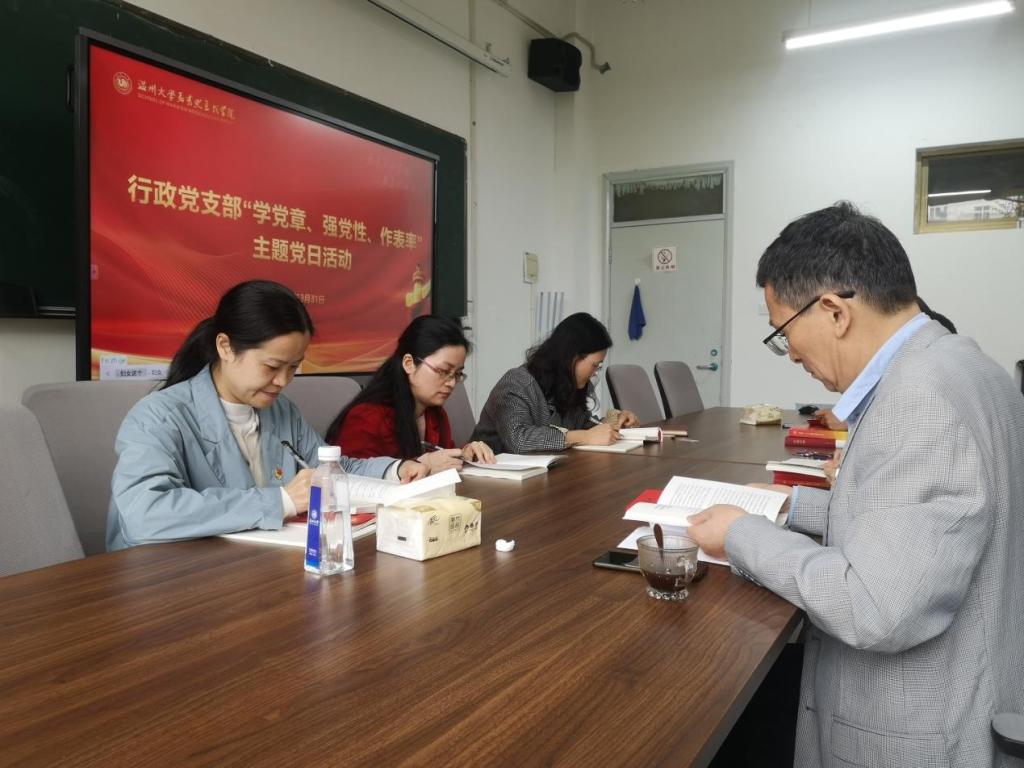 为深入学习贯彻党的二十大精神,深刻领会党章修正案的科学性与先进性,4月3日下午,学院行政党支部开展以“学党章、强党性、作表率”为主题的支部主题党日活动。活动由学院党委副书记叶柏霜主持,学院党委书记王柏民以及各行政岗党员出席。