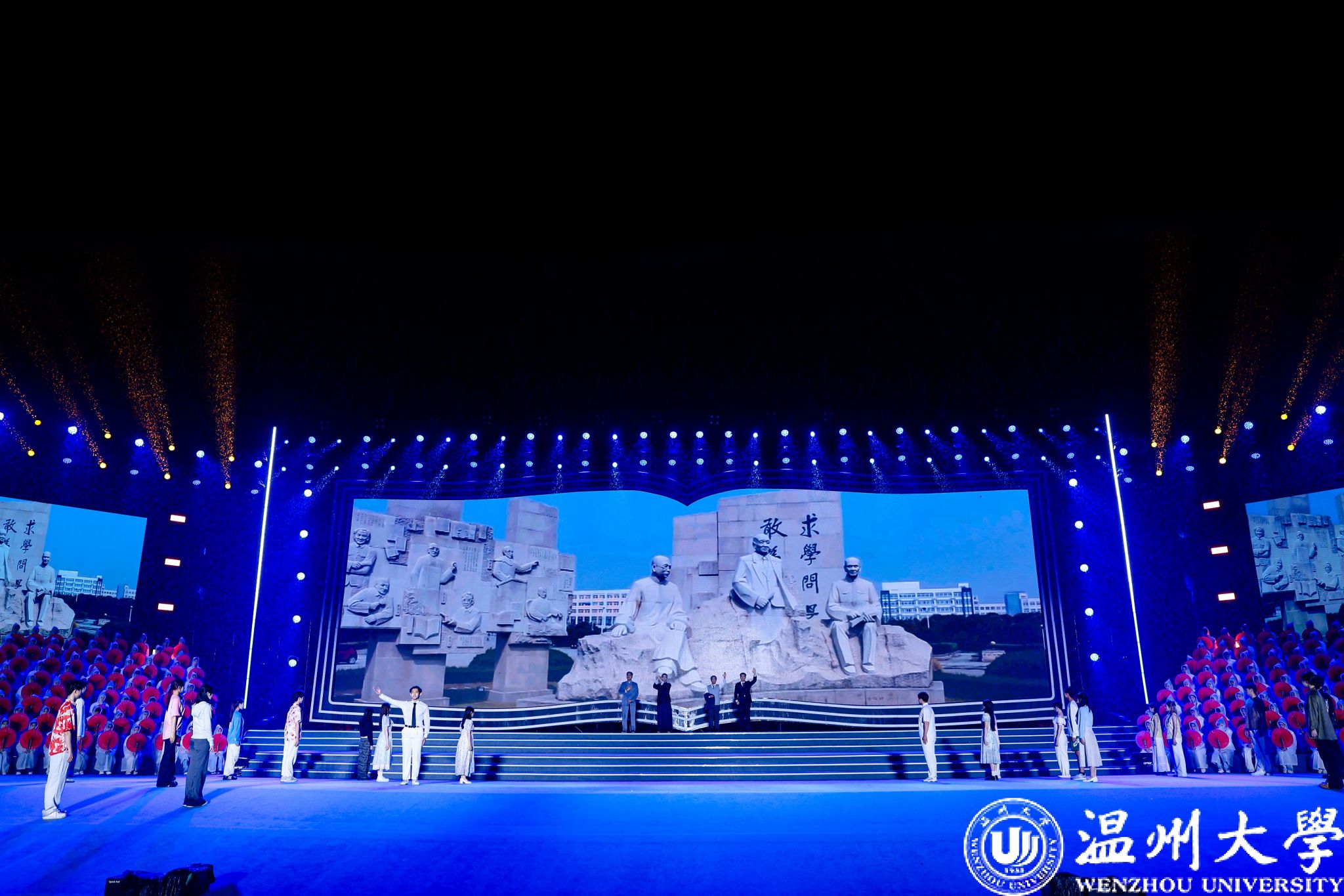 诗剧《对话先贤》与情景大合唱《我爱温大》穿越时间长河,用青春之声讲述峥嵘校史。通过多元化形式回溯学校艰辛办学历程,充分展现了历代温大人教育报国、救亡图存的执着情怀和不畏艰难、艰苦创业的办学精神。师生目光紧随画面流转,心潮澎湃、眼泛泪光。24级应用心理学专业的夏欣温尔同学认为四位先贤师友跨越时空“齐聚一堂”为新生送上祝福,为温大规划蓝图是最令她印象深刻的,“这堂课将爱国情怀和人文精神相结合,让我对未来在温大的求学之路充满了期待。”