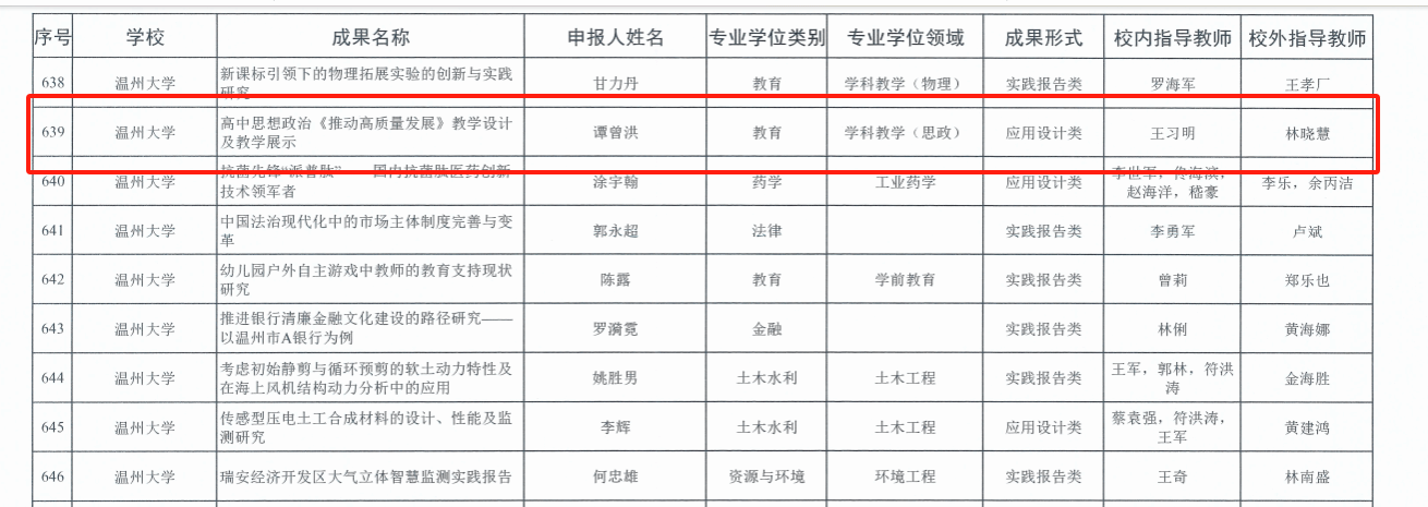 近日,浙江省研究生教育学会公布了2024年浙江省优秀研究生教学案例认定结果以及2023年浙江省专业学位研究生优秀实践成果评选结果。我院2022级学科教学(思政)专业研究生谭曾洪的“高中思想政治《推动高质量发展》教学设计及教学展示”成功入选2023年浙江省专业学位研究生优秀实践成果。