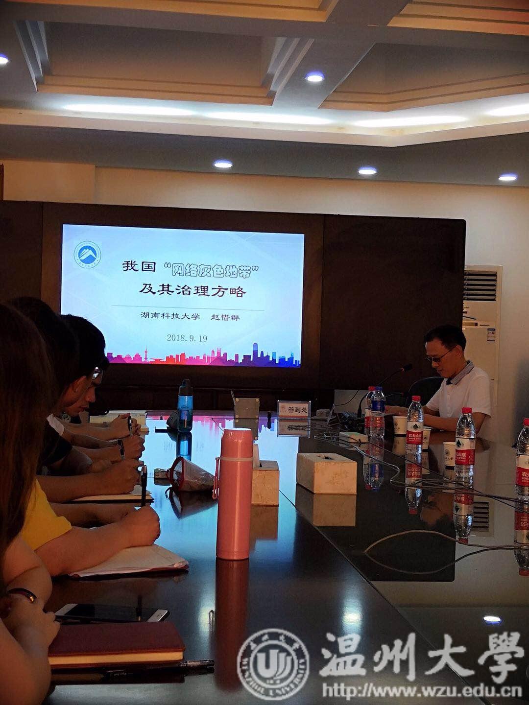 9月20日上午,湖南科技大学赵惜群教授、北华大学赵贵臣教授应邀来到yl6809永利,在北校区行政楼227会议室为我院师生分别做了以《我国“网络灰色地带”及其治理方略》和《小议“和谐”》为主题的精彩讲座。此次讲座由孙武安院长主持,我院2018级马原研究生和部分师生参加了本次讲座。