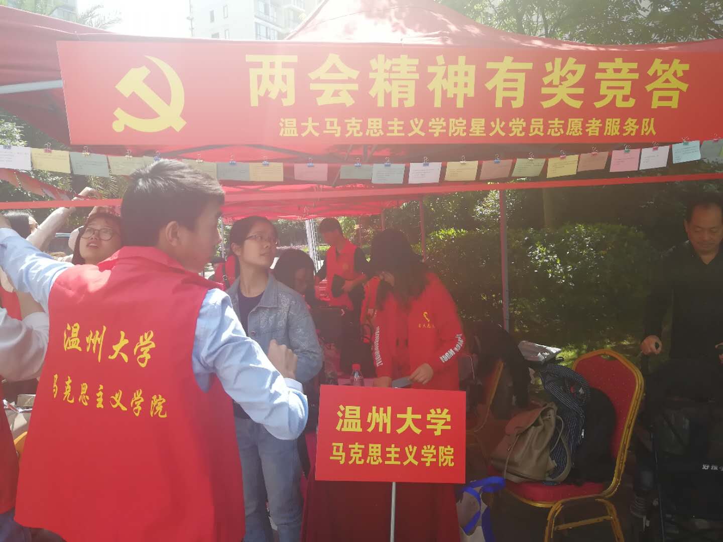项目启动仪式主由博园社区党支部书记与各志愿团体签约并授牌、与会领导向签约单位授志愿者队旗以及签约代表上台认领服务项目等议程,马院研究生党支部书记徐晶晶同志代表我院星火服务队接受了该活动授予的志愿者队旗,并挥动队旗展示星火服务队风貌,党支部委员洪丽丽、孟江龙同志代表星火服务队上台认领服务项目。此项目启动仪式结束,各志愿者单位在博园社区文化广场有序地开展志愿服务,服务项目多样,比如“免费配钥匙”、“免费贴膜”等,作为马院的一份子,星火服务队紧跟时代潮流,为更好向博园社区居民传播两会精神,组织了“两会知识有奖竞猜”的活动。
