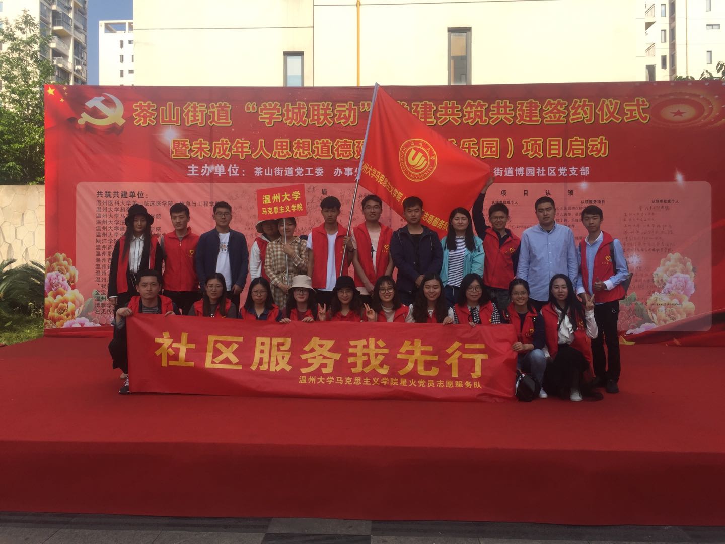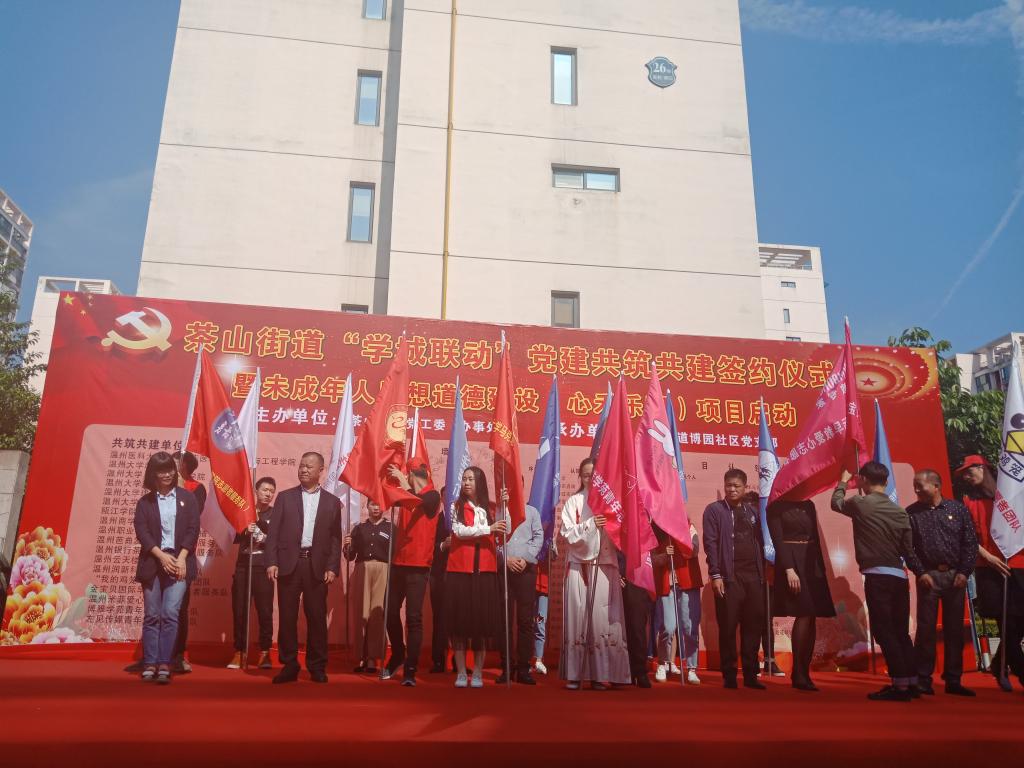 4月18日下午,瓯海区茶山街道党工委、办事处在博园社区文化广场举行茶山街道“学城联动”党建共建共筑签约仪式暨未成年人思想道德建设“心禾乐园”项目启动仪式,出席活动的有瓯海区委组织部、博园社区及永利集团yl6809超豪学区等单位领导,马院研究生星火服务队作为志愿项目认领团队参与了此次仪式。