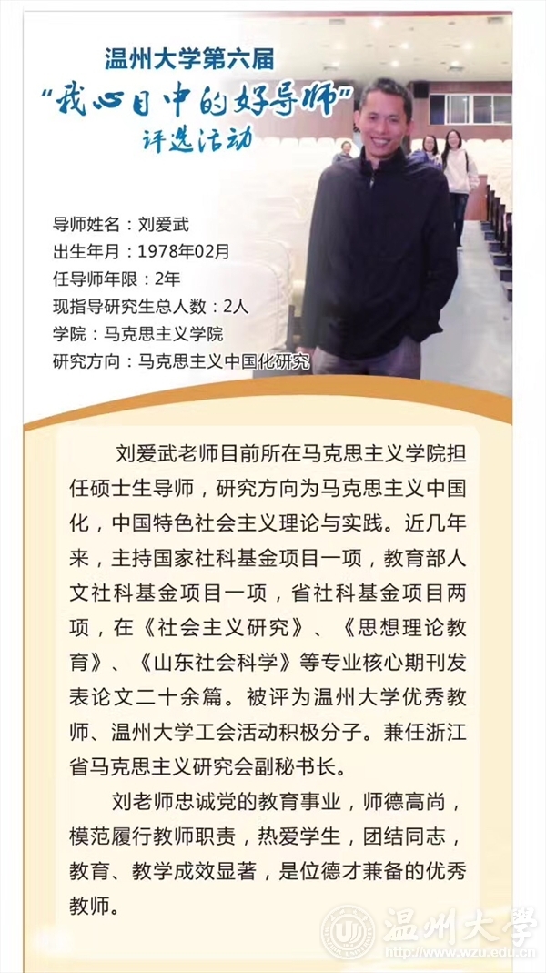 刘爱武老师作为本院的硕士生导师,从事马克思主义中国化研究若干年,刻苦专研学术,主持过国家社科基金项目一项,教育部人文社科基金项目一项,省社科基金项目两项,于各大核心期刊发表论文二十余篇。