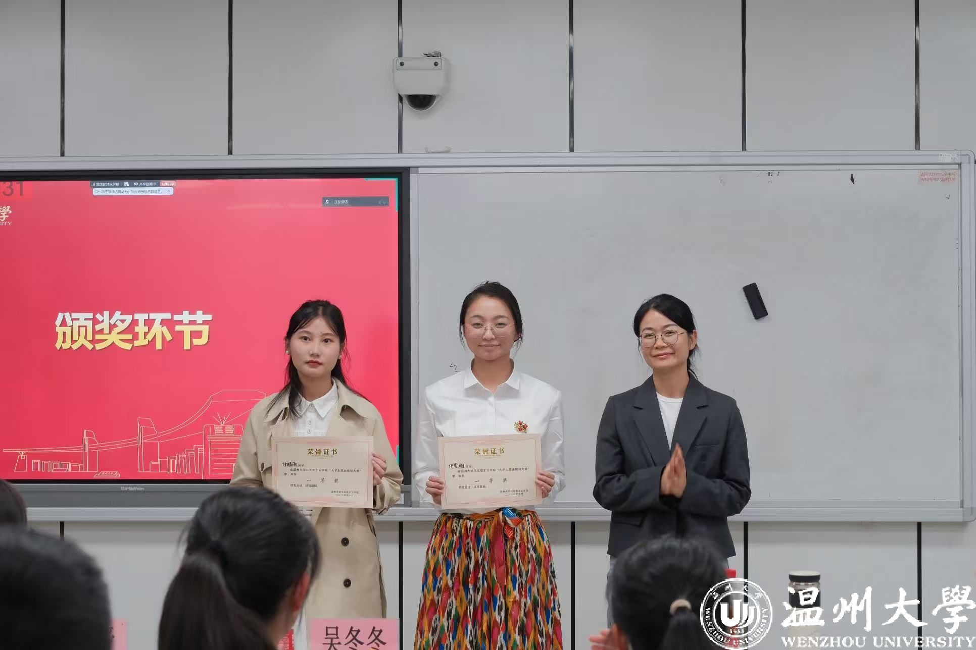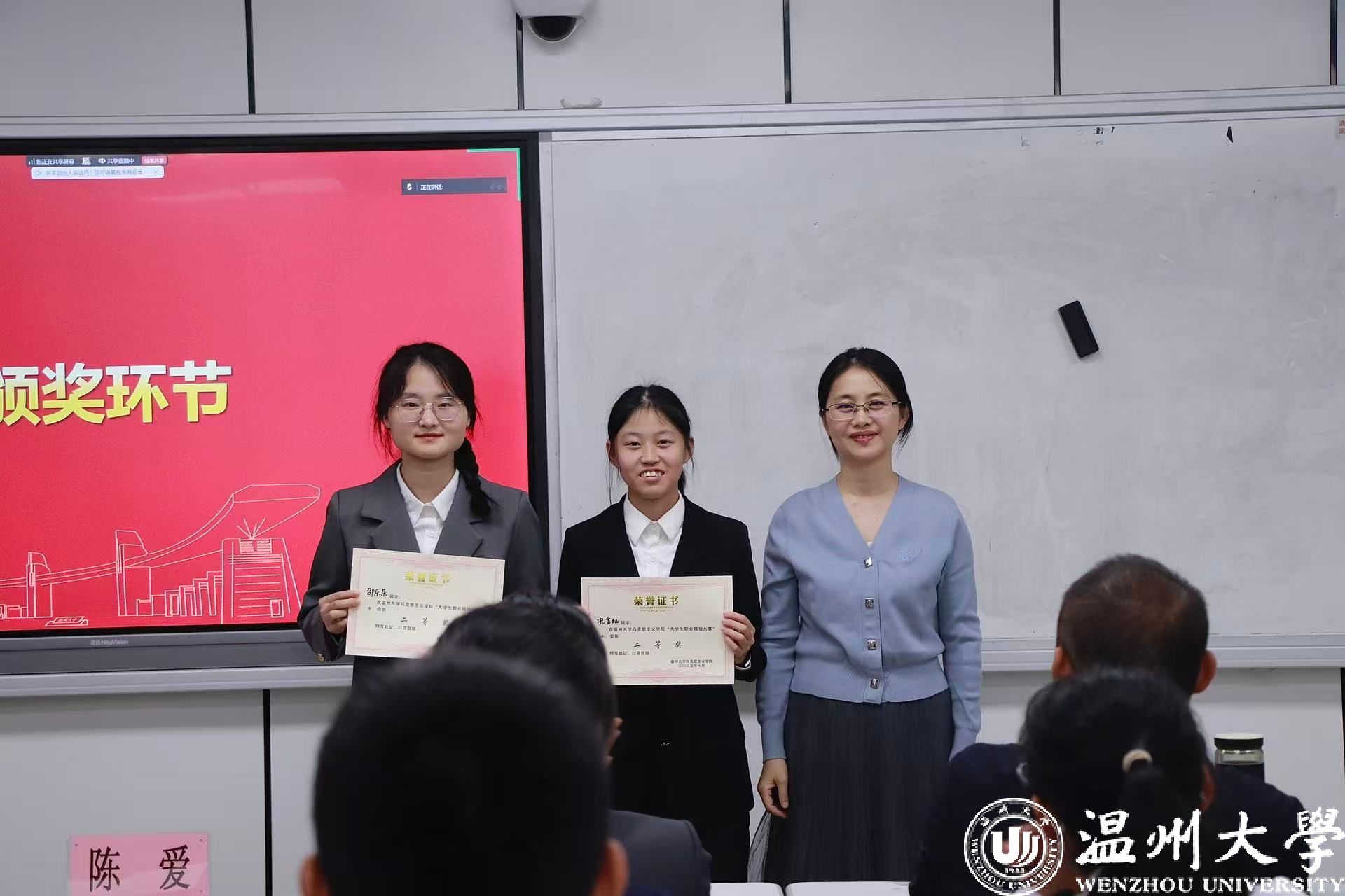 在颁奖环节,三位评委老师依次为获胜选手们颁发奖状,并与之合影留念,共同见证这一殊荣时刻。