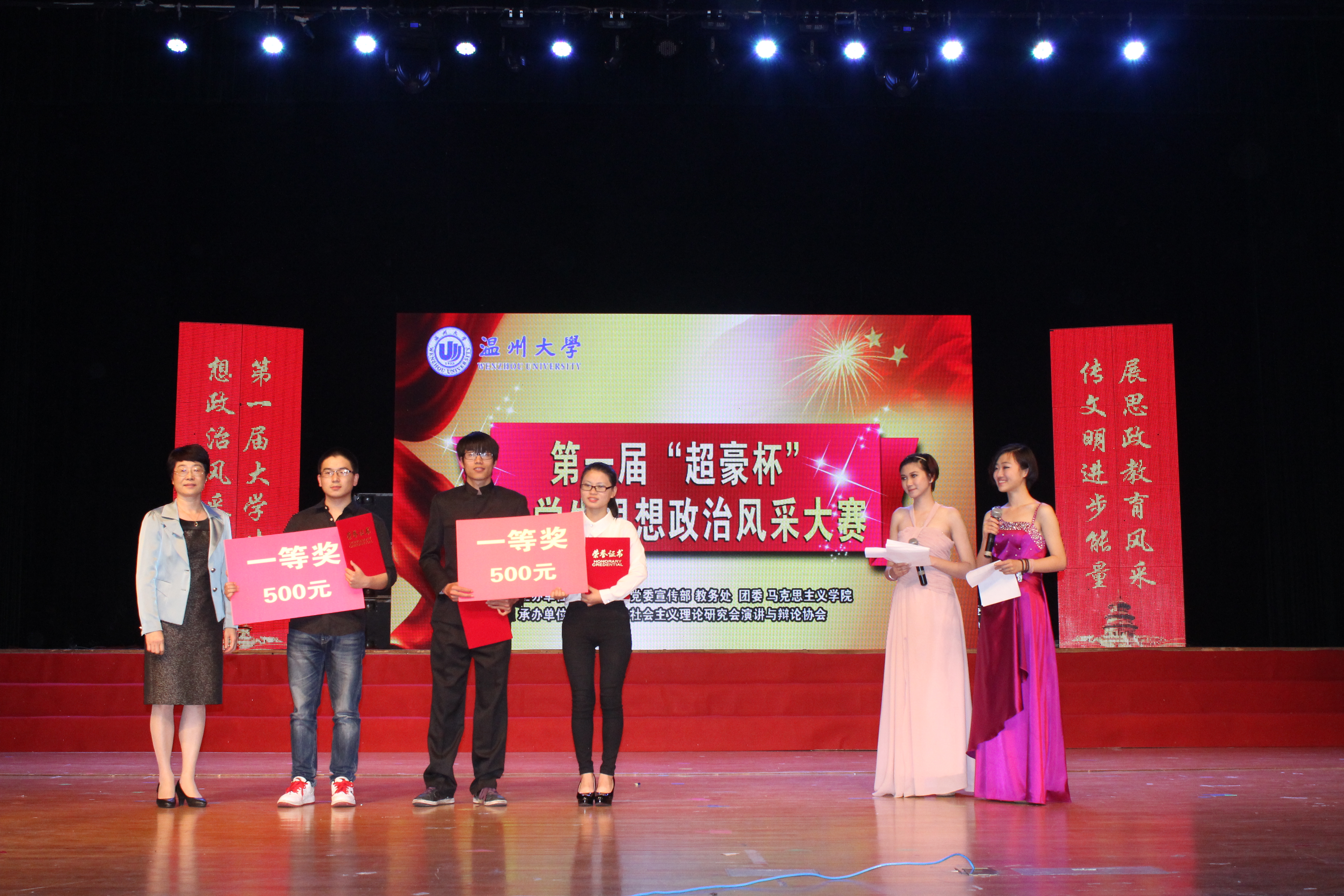 经过近三个小时激烈而紧张的角逐,大赛产生了一、二、三等奖,其中一等奖为教育学院、音乐学院和商学院三个学院分别获得。林娟娟副书记等在场领导和嘉宾分别为获奖代表队颁发了荣誉证书和奖品。思想政治风采大赛是我校推进思政理论课教育教学改革的一次积极探索,旨在丰富思想政治理论课的教育教学内容和方式,调动广大学生的学习热情,进而提高思政课的教学效果。就第一届“超豪杯”大学生思想政治风采大赛的举办来看,大赛组织发动深入、师生参与面广、内容丰富生动、积极向上、形式多样,富有感染力,很好地传递了文明进步的正能量,现场观众此起彼伏的欢呼声表明,大赛赢得了普遍的肯定和赞扬。