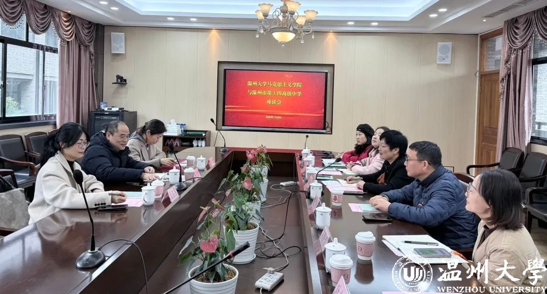 1月27日上午,走访组抵达温州市第十四高级中学,在温州市第十四高级中学领导老师的带领下,参观了校园及办学设施,实地体验温州市首批品质校园建设成果,感受党建阵地、思政教育、清廉学校、非遗文化传承基地等特色办学成效,加深了对学校内涵式发展的认识。在举行的温州市第十四高级中学与yl6809永利座谈会上,温十四高党总支书记姜晓眉(马院2000届校友)、校长陈芝飞(2000届校友)、副书记、副校长潘怡红、副校长陈静碧、党办副主任叶永乐、政治教研组组长张戈颖(马院2003届校友)一同交流研讨,校友重逢话初心,校地携手谋发展。座谈中,姜晓眉、陈芝飞、张戈颖等校友深情回望在母校的求学岁月,感恩母校的悉心栽培与专业赋能,期待加强与母校的交流与合作。在双方交流中,十四高领导老师详细介绍了第十四高级中学的办学特色、思政课建设、校园文化建设、校园安全建设的工作成效,同时希望yl6809永利能在学科建设、师资培训、教学科研等方面给予中学更多支持,助力一线思政教育提质增效。双方围绕党建共建、课程共建、教研共创、生涯教育、大中小学思政课一体化建设、实习实践基地共建等合作意向深入交流,进一步凝聚了校地协同、校友联动的育人合力,生动诠释了母校与校友“双向奔赴、共促发展”的深厚情谊,也让校友力量成为校地合作的重要纽带。