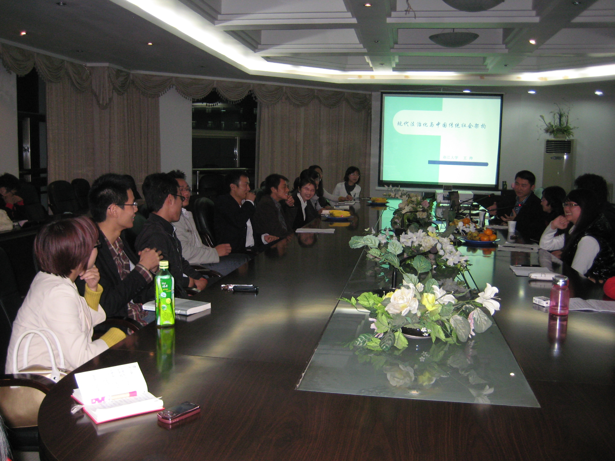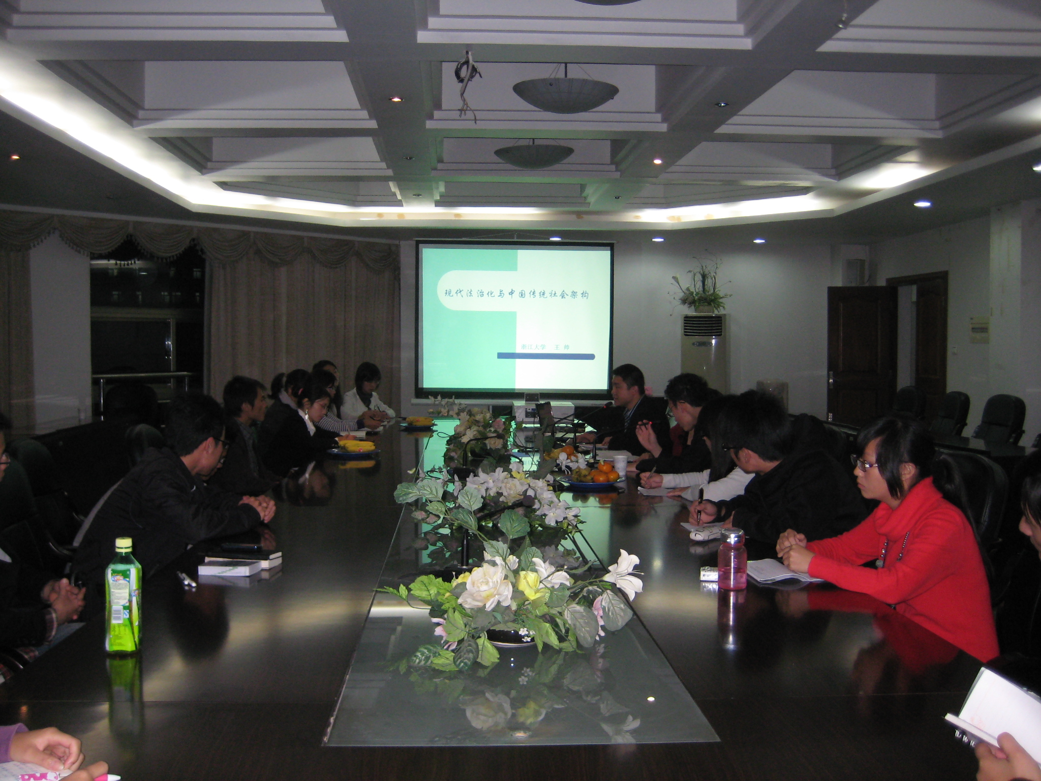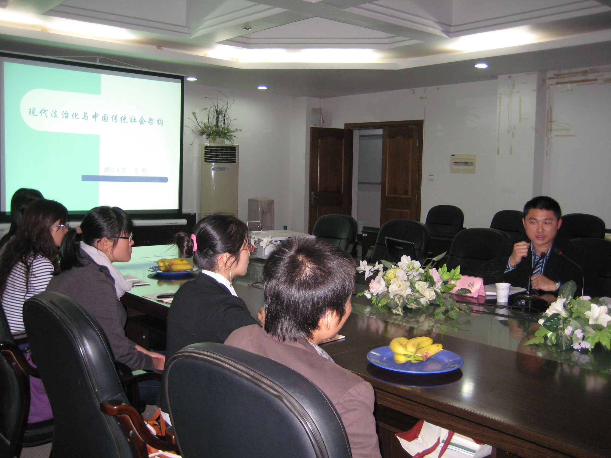 为活跃思政部研究生学术研究气氛,引导研究生树立崇尚科学,推动锐意创新的精神,同时,为扩大研究生的学术研究视野,加强与兄弟院校的学术交流,10月26日晚,浙江大学研究生求是学社社长、法学院博士生会主席王帅博士应永利集团yl6809思政部研究生会邀请在北校区行政楼227室做了“现代法治化与中国传统社会架构”的主题演讲。参加本次学术沙龙活动的有思政部研究生班主任卓高生博士,思政部全体研究生和法政学院部分研究生。会议由思政部研究生会主席徐丽同学主持。