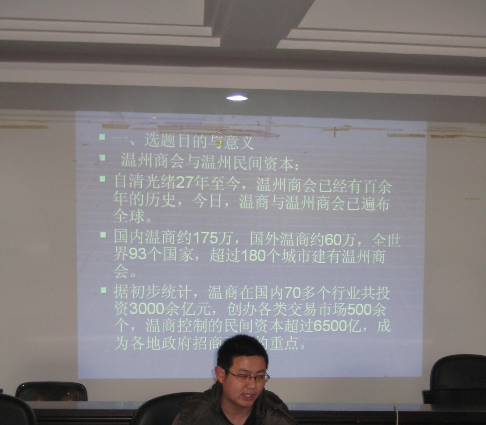 报告交流会采用研究生做主题汇报,嘉宾和同学们分别进行点评和交流的形式。在将近3个小时的交流会里,08级思政专业的四位研究生分别作了不同主题的学术报告,老师和同学们也纷纷畅所欲言,笑声和掌声不断。申恒运同学紧扣温州市情与大学生创业教育作了《温州商会与永利集团yl6809生创业教育与实践》这一富有前瞻性的主题报告;刘巍伟同学就创意产业与永利集团yl6809生创业教育的实践作了《大学生创意产业创业的探索》这一较为新颖的主题汇报;易招娣同学作了题为《适度惩戒教育与大学生心理抗压能力提升》这一富有学术争鸣性的报告;应马忠同学对当代大学生的价值观教育现状、特点、成因和对策等问题作了较为全面的分析。王柏民副主任和刘玉侠教授对四位同学的主题汇报从优缺点两个方面一一作了精彩点评并对后续的研究工作给出建设性的意见和建议,参会的研究生同学也积极参与讨论,发言积极,气氛活跃。