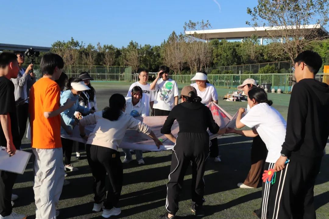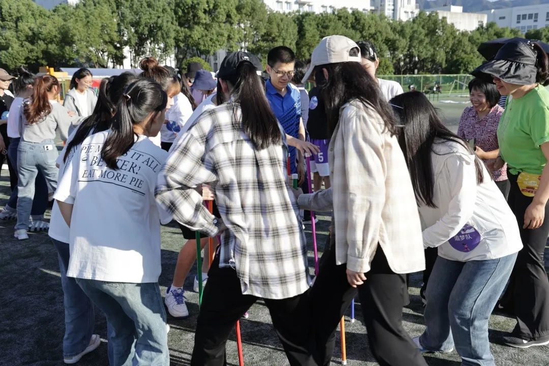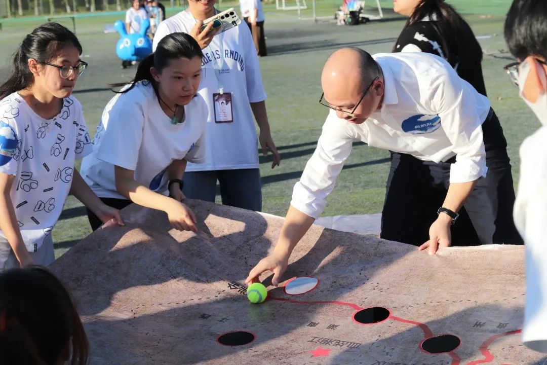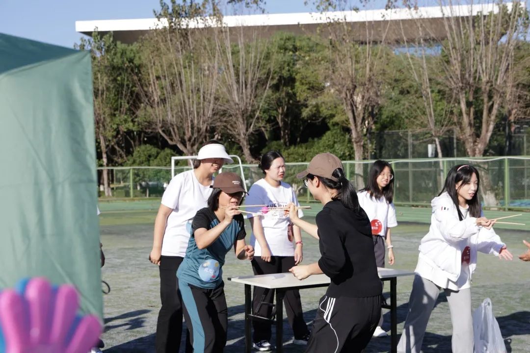 比赛在同学们的加油呐喊声中拉开帷幕。比赛共有筷子夹乒乓球+PC管运球+穿越呼啦圈、不倒森林、趣味毛毛虫、定向打卡四项。各项活动在同学们的组织下有序开展。比赛的氛围也在老师们与同学们的积极讨论,合作配合中持续升温,球与球,手拉手地传递也让老师和同学愈发默契,秋日暖阳映照下,每个人的脸上都洋溢着团结一致奔赴胜利的喜悦。