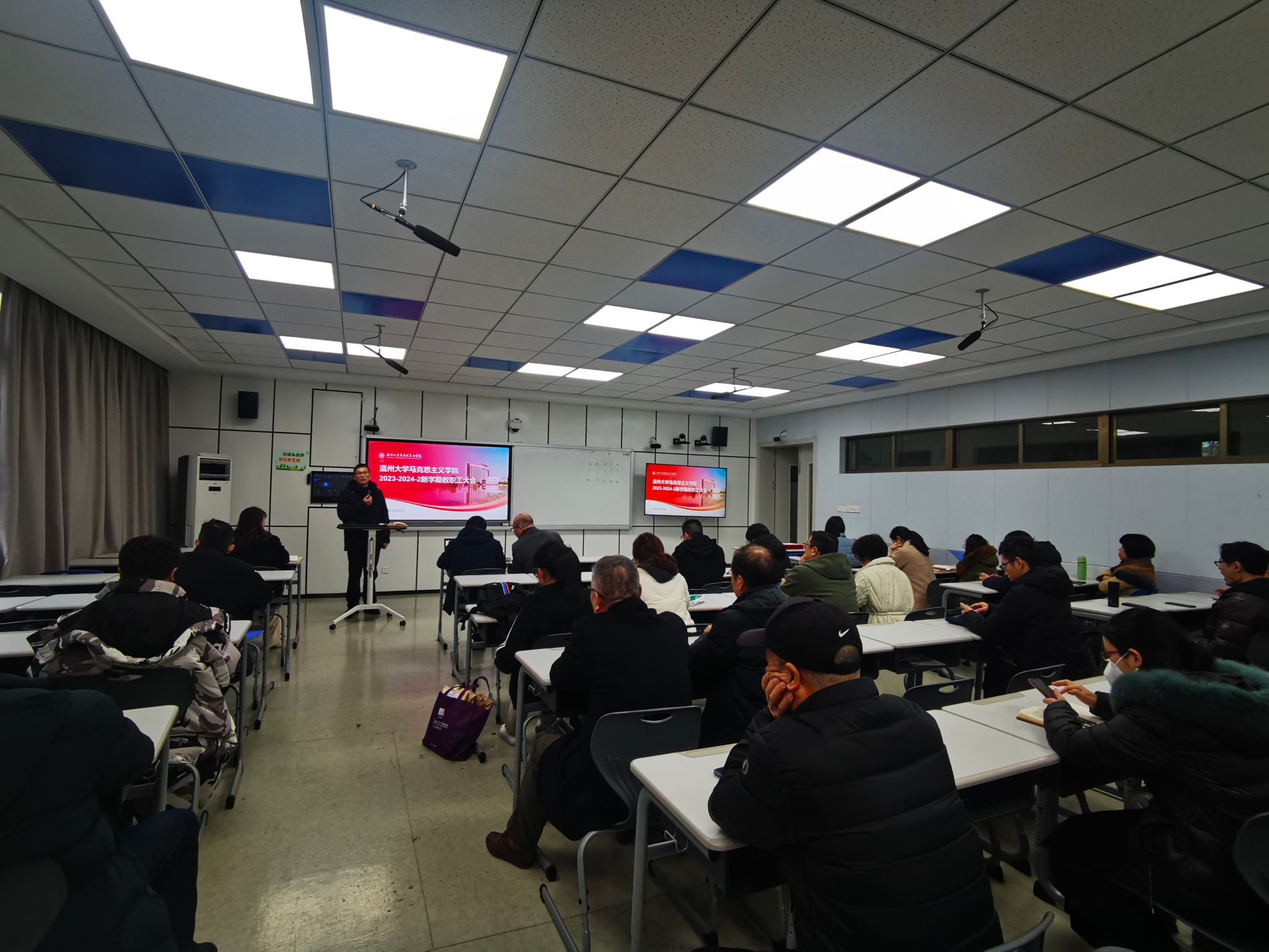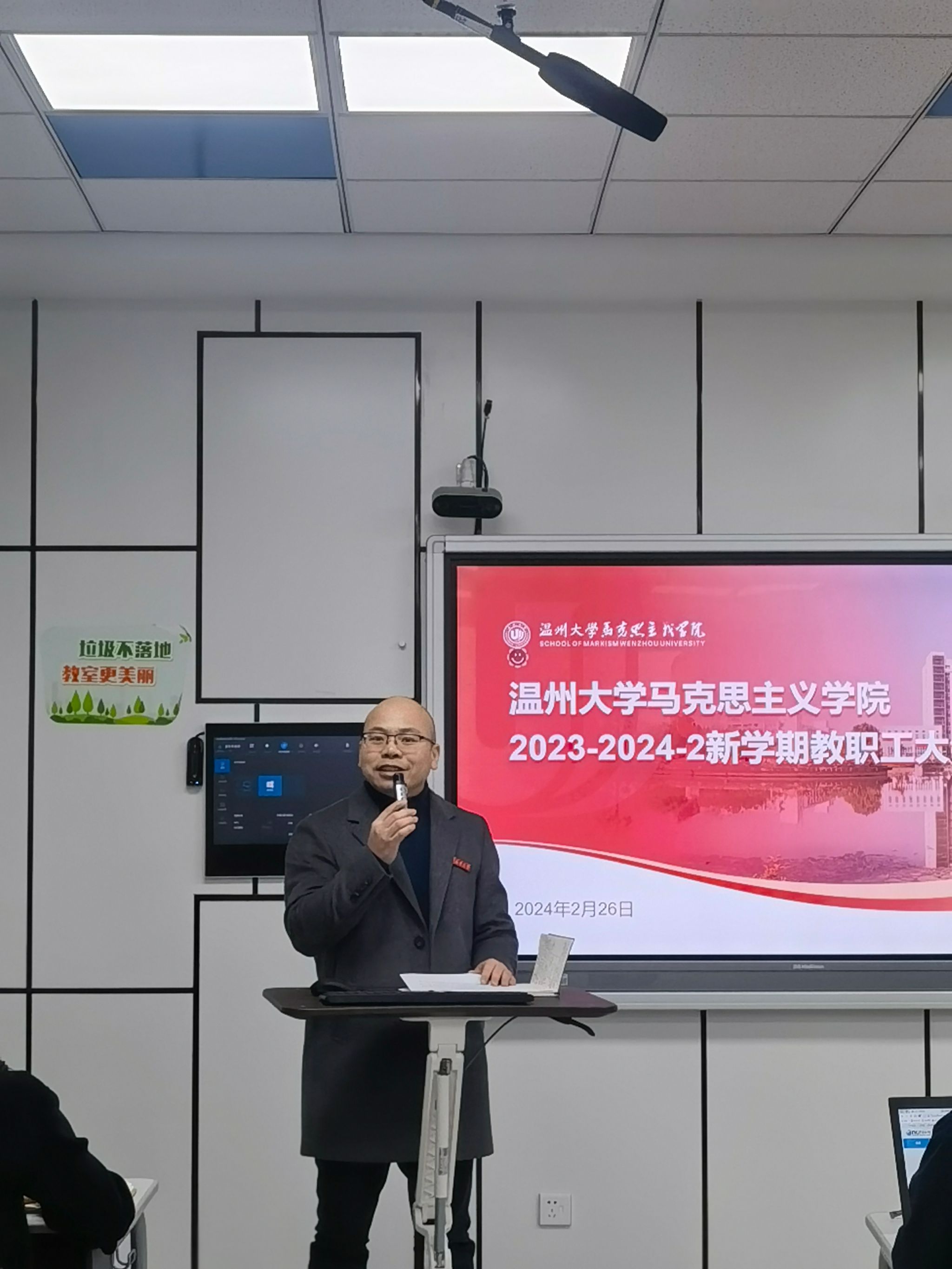 卓高生院长发表了热情洋溢的讲话。他首先高度肯定了学院全体教师在2023年度取得的辉煌成绩。在过去的一年里,我院教师团队在教学科研一线积极参与,发挥重要作用,荣获了多项荣誉,参与教育部高校思政精品项目申报团队、卓越教师教学创新团队并荣获校长特别奖(团队)荣誉;王习明老师荣获校长特别奖(个人)荣誉;中共温州市委学习贯彻习近平新时代中国特色社会主义思想主题教育领导小组向我院发来表扬信,对詹良水博士挂职期间的优异工作表现进行了嘉奖。以上荣誉充分展示了我院教师的卓越实力和团队合作精神。同时,学院也荣获了2023年度学院综合业绩考核优秀单位的殊荣,这是对我院整体工作的高度肯定。