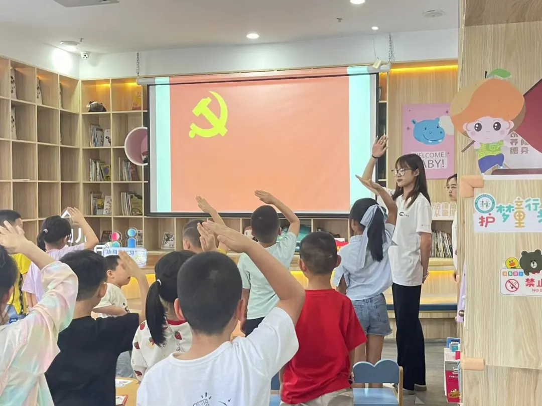 接着,未成年人跟着志愿者一边学习《红星闪闪》儿歌手势舞,一边唱着“红星闪闪放光彩,红星灿灿暖胸怀,跟着毛主席跟着党,闪闪的红星传万代。”最朴实的歌词,唱出了他们对党的敬爱。