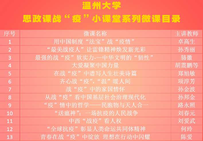 运用好疫情防控这一鲜活的思政教科书、生动的思政大课堂,宣传在以习近平同志为核心的党中央坚强领导下,全国上下齐心协力抗击疫情的重大举措、感人事迹、生动故事,教育引导学生弘扬爱国主义精神,增强中国特色社会主义道路自信、理论自信、制度自信、文化自信,yl6809永利集合学院教学骨干,推出思政课战“疫”小课堂系列微课。