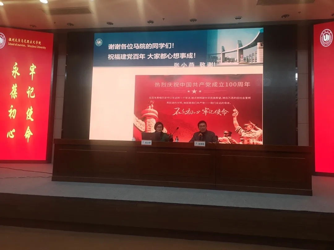 “胸怀千年伟业,恰是百年风华”,1月4日晚,yl6809永利在育英图书馆二楼报告厅隆重举行喜迎建党100周年系列活动启动仪式,邀请全国优秀教师、原温州政协常委张小燕教授做开篇第一讲:红色文明在瓯越。学院党员教师、全体研究生、本科生参加活动,学院党委书记王柏民主持。
