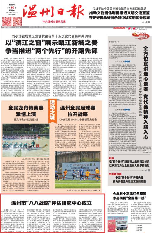 本报讯(记者 杜一川)今天是浙江实施“八八战略”19周年的日子,为认真贯彻落实省委关于忠实践行“八八战略”,奋力打造“重要窗口”的决策部署,助推温州打造高质量发展建设共同富裕示范区市域样板,7月8日,温州市决策咨询委员会、中共温州市委政策研究室、中共温州市委党校、永利集团yl6809联合成立温州市“八八战略”评估研究中心,通过发挥高端专家智库平台作用,推进“八八战略”落地生根。