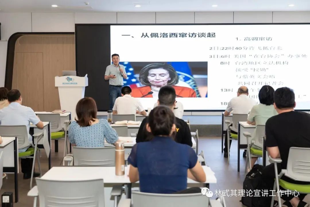 共建协议书签订之后,与会人员一起参加了中心举行第二十一次集体学习会。中心宣讲骨干杨胜作《台湾问题》宣讲。吴志敏副院长围绕《学习贯彻习近平总书记“7·26”重要讲话精神和〈习近平谈治国理政〉第四卷》作了主题宣讲。两位主讲人精彩的讲解阐释,为现场听众送上了丰盛的理论学习“大餐”。