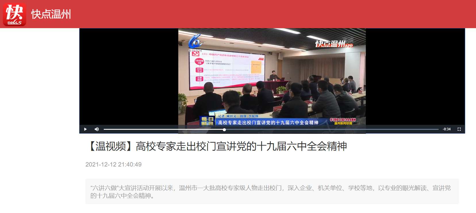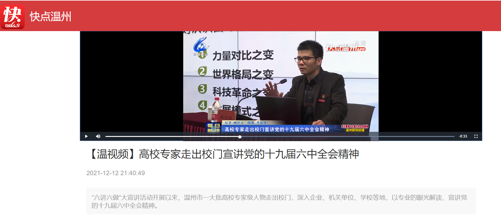 温州电视台:我校教授走出校门宣讲党的十九届六中全会精神